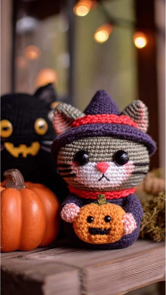 What fun it is to create Halloween-themed plushies! These little cats with their hats and pumpkins add a cozy feel to my holiday decór and let me show my style in every stitch.
