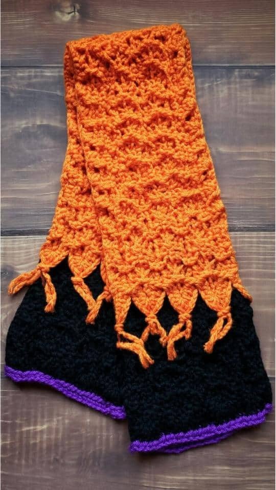 A crochet scarf adds fun to my fall clothes. The orange and black colors make me think of Halloween night. The small fringes give it a playful look that stands out.