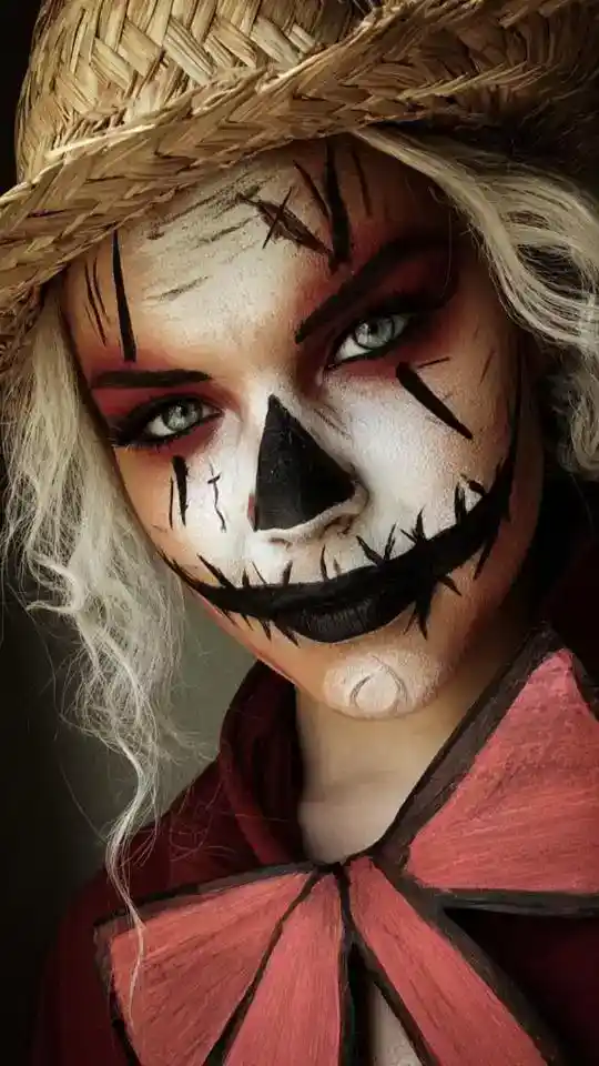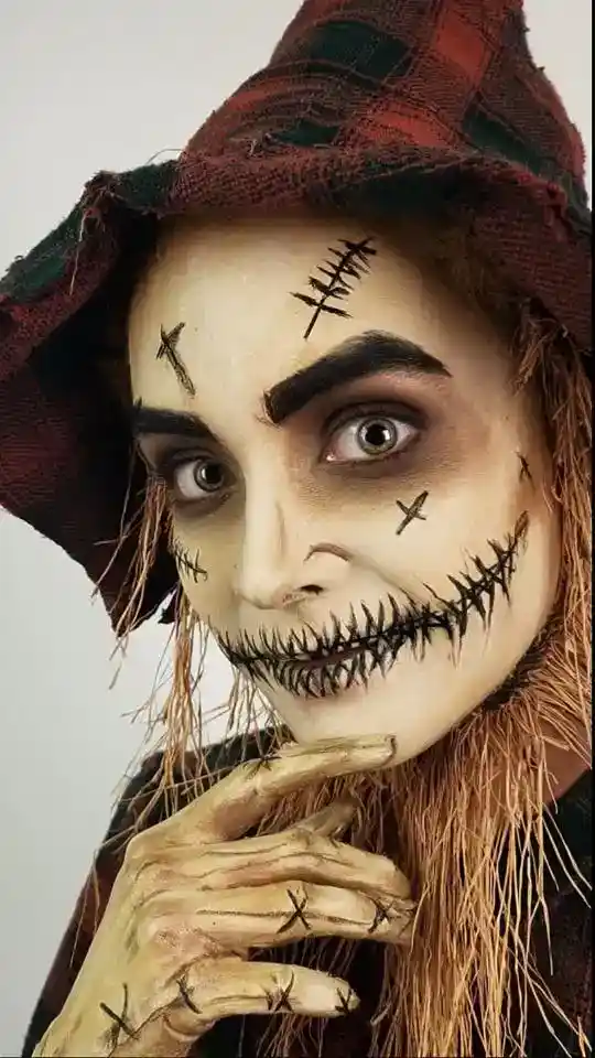 Scarecrow face paint always helps me look bold without needing anything fancy. I mix black and brown watercolor shades to get the stitched look just right.