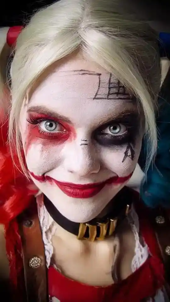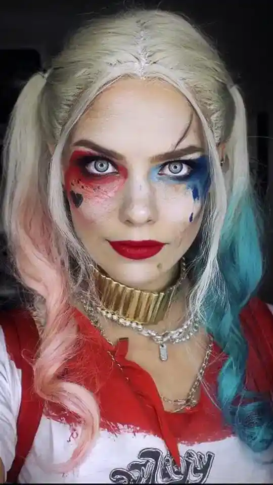 It’s hard not to notice Harley Quinn’s bold watercolor style, right? The bright red and blue around my eyes with a playful smile always pulls attention and makes my costume feel full of fun.