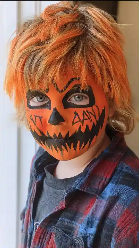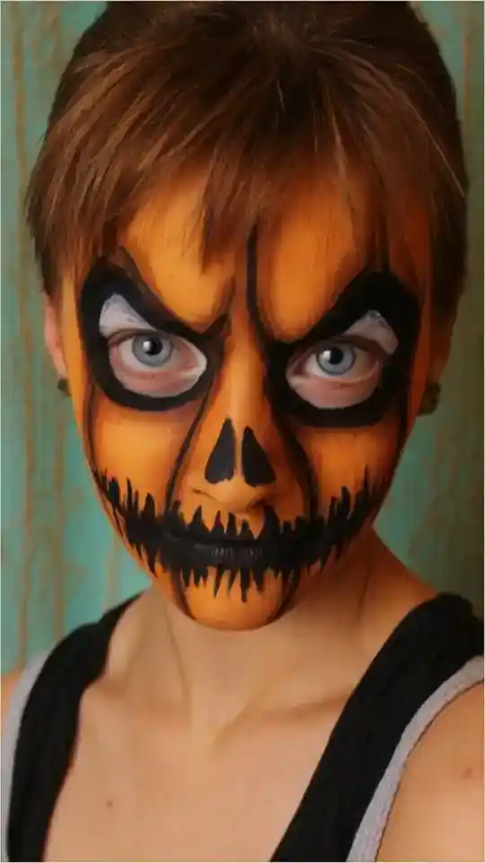 Painting the face bright orange with bold black lines around the eyes, nose, and mouth instantly turns anyone into a glowing pumpkin ready for the night.