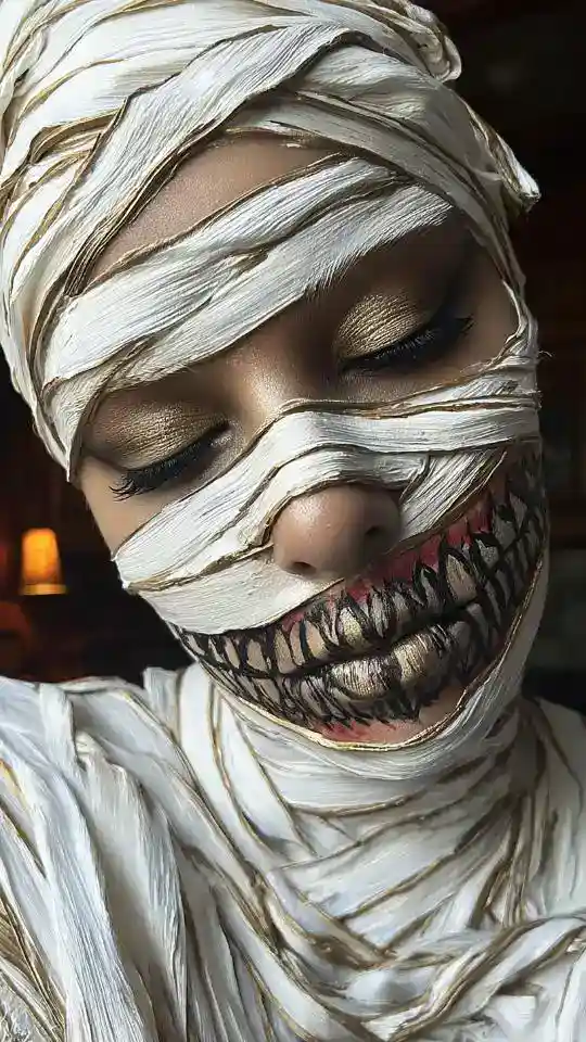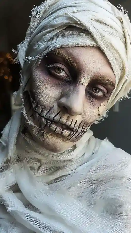 I enjoy turning into a mummy with face paint that looks like soft, wrapped bandages and stitched mouths. This style is quick to do and works well for any age.