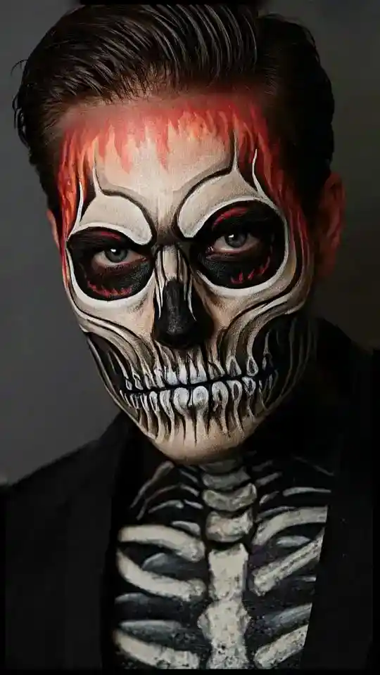 Bold red shades against black skeletal lines deliver an intense Halloween face paint that turns heads fast. It draws focus to your eyes and brings a bold, fearless energy to your look.