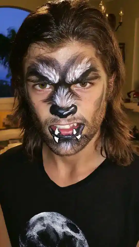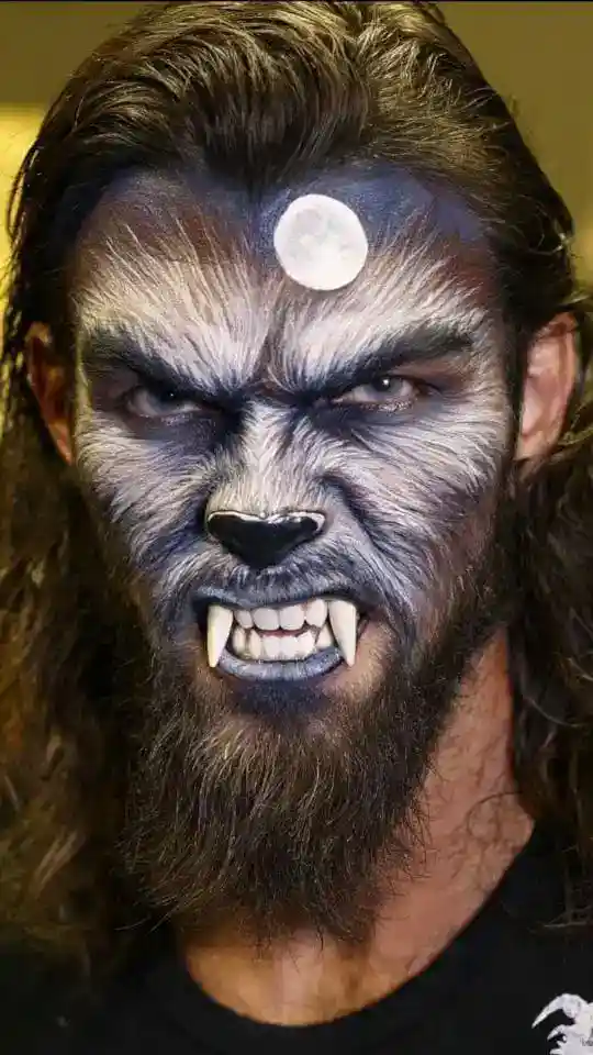 Painting my face as a werewolf always brings out my wild side. I mix dark and light strokes to create a fierce look, and adding sharp teeth makes the design stand out right away.