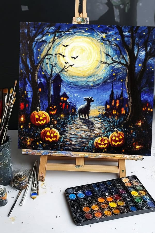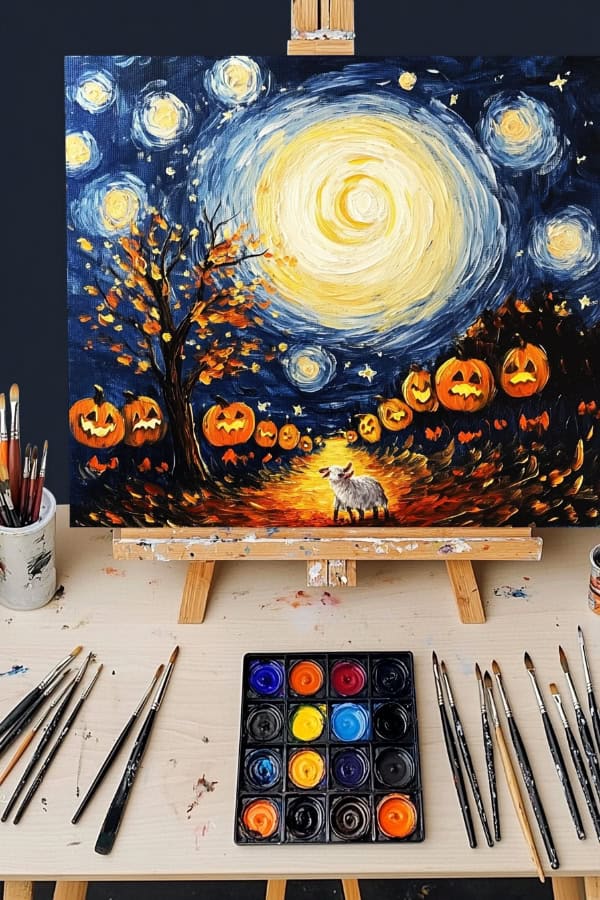 Let’s take Van Gogh’s Starry Night and make it spooky! Imagine swirls of deep blues and yellows. Now add glowing pumpkins scattered across the scene. This painting idea is perfect for beginners.