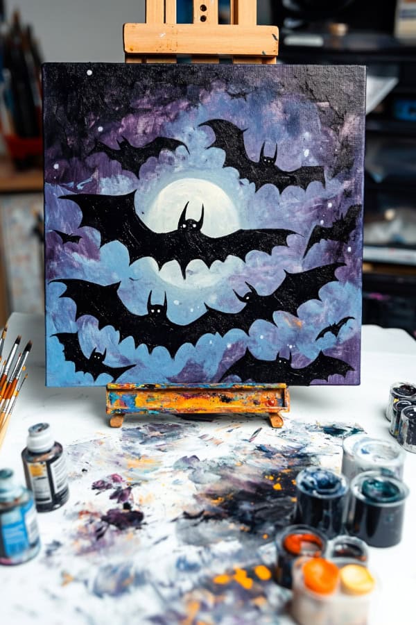We can paint dark bats flying against a mystical moonlit night sky. This Halloween painting idea is both spooky and fun, perfect for beginners.