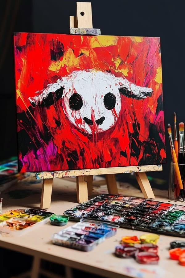 Let’s switch gears from the mysterious cat to something more intense. The Bloody Lamb Head painting stands out with its shocking red background and splashes of blood. This idea adds a fear factor that is perfect for Halloween.
