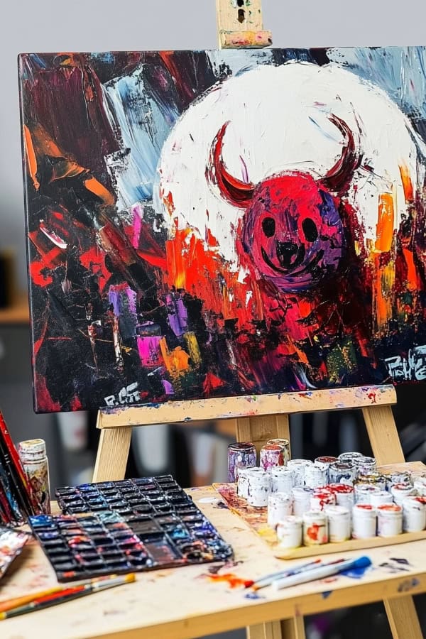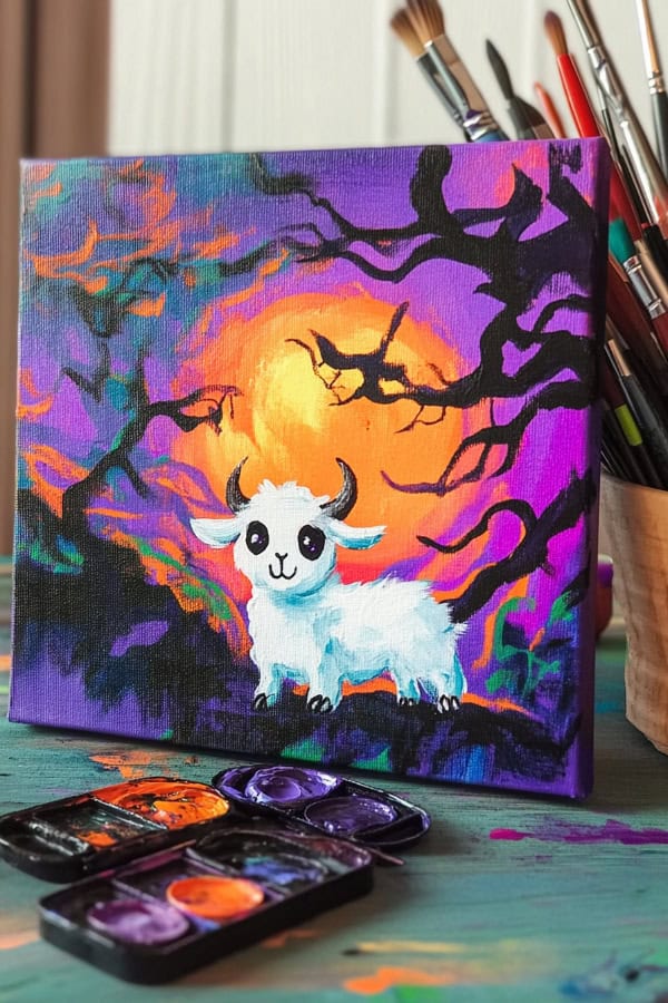 Let's paint a cute white goat under a colorful night sky. This idea mixes charm with Halloween spirit, making it fun for everyone. Start by painting the background with vivid colors like purple, blue, and pink.