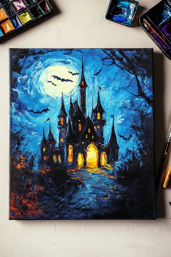 We can paint a spooky castle. It glows under a bright, haunting full moon. The eerie light makes the scene perfect for Halloween painting ideas. Use dark colors for the castle to make it stand out against the glowing moon.