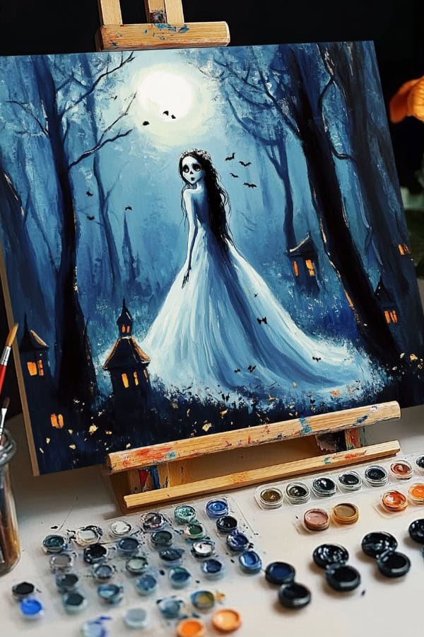 Start by painting the foggy landscape first. Use grays and blacks to create depth. Next, add the ghostly bride in white. Let her glow against the dark scene. No need for intricate details; simple brush strokes work best here.