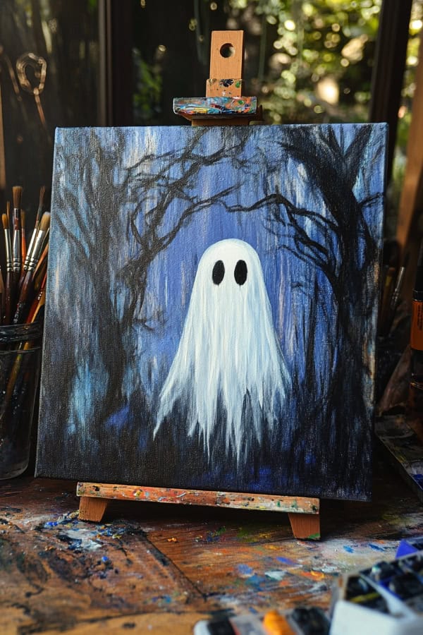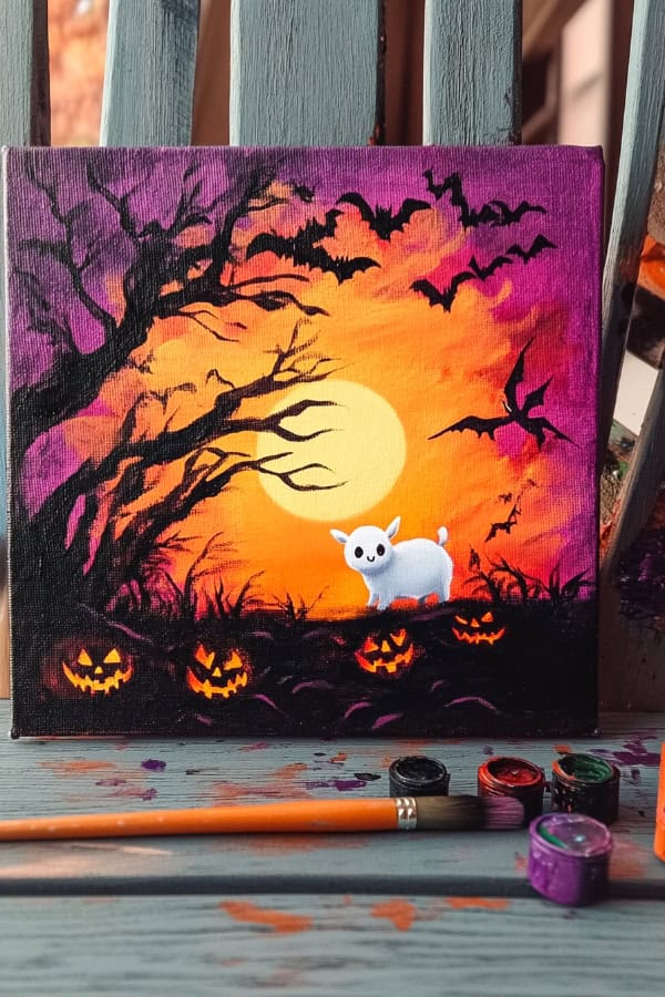 This painting idea is perfect for beginners. It uses simple shapes and gentle brush strokes. It's a great way to add a spooky touch to your Halloween collection!