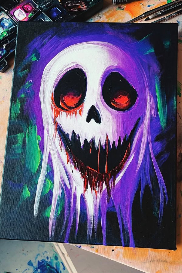 Ghosts in a forest create spooky scenes, but nothing beats the terror of our next idea. Imagine painting a ghost face with bleeding eyes and a scary smile. This creepy artwork will send chills down anyone's spine.