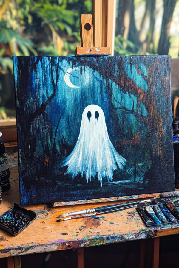 A ghost floats quietly in a dark, haunted forest. The shadows make the scene eerie and mysterious. We can use soft, light colors to paint the ghost. Dark greens and blacks create the forest background.