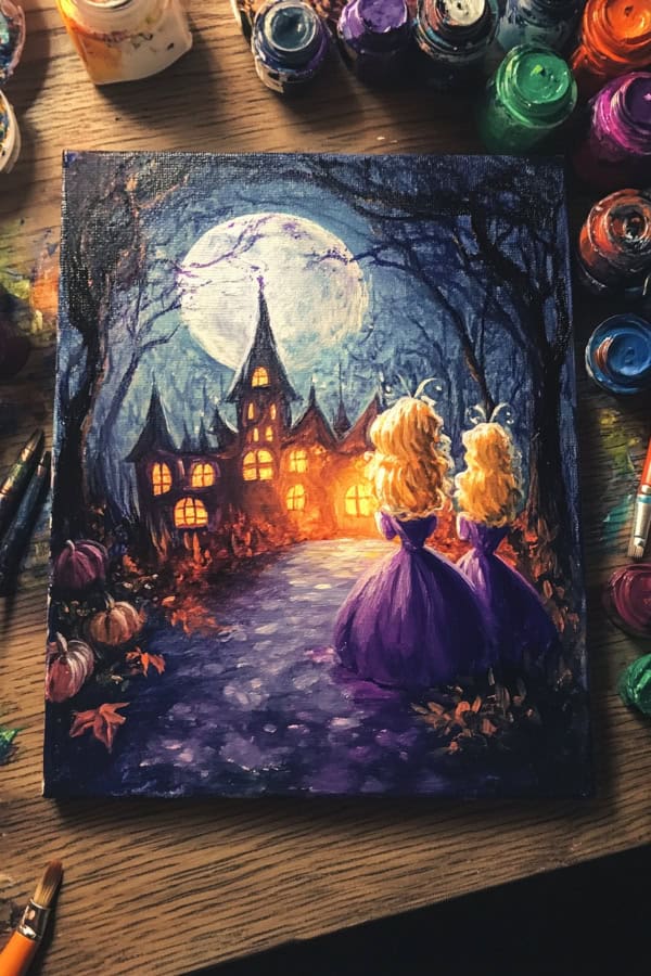 We see shadows, tall towers, and glowing windows. This scene is perfect for beginners who love fairytales and Halloween paintings on canvas ideas. Use dark purples and blues to create the night sky.