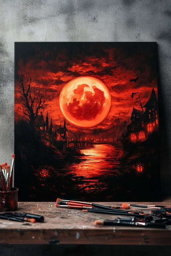A blood-red moon glows over a dark, eerie river. We can paint this haunting scene on canvas with simple strokes. First, let's use deep reds and blacks for the sky. Then, add a glowing red circle for the moon.