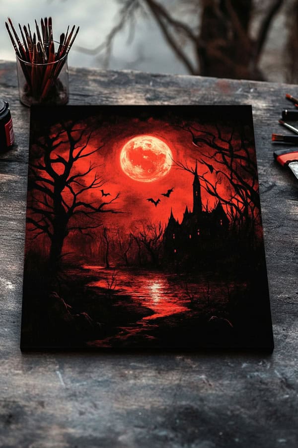 This idea is perfect for beginners who enjoy spooky themes. It’s simple, yet striking. We can hang this on our wall as part of our Halloween decor. Painting this will help us learn how to blend colors and create shadows, adding depth to our work.