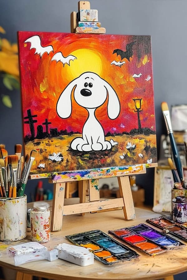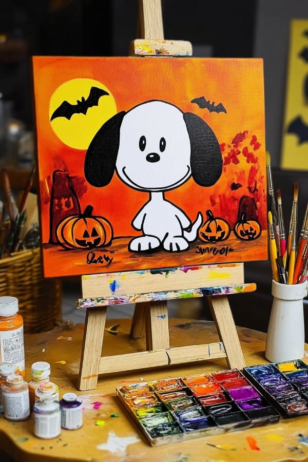 Let's paint Snoopy for Halloween! We can put him next to some pumpkins. Add flying bats around him. Use bright colors for the pumpkins and dark shades for the bats. This will make our painting pop!
