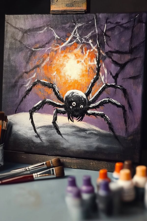 A creepy spider crawls under a glowing orange moon. Its dark body stands out against the bright sky. Webs stretch all around, adding to the eerie scene. This Halloween painting can be fun for beginners.