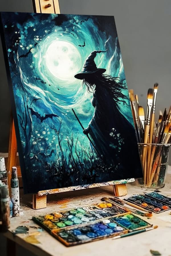 We can paint a mystic witch holding her staff. She stands under a magical greenish moon. This idea mixes charm and mystery, making it fun for beginners.