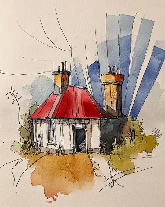 While the ink details highlight the windows and entrance, the gentle watercolor washes add warmth and life to the bricks.