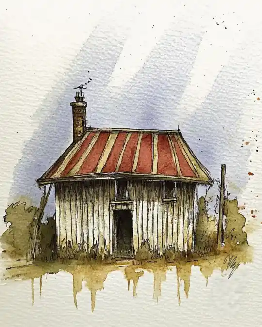I begin with a loose background wash before adding features like the door and windows with sharper lines.