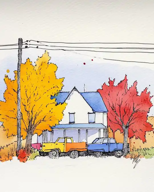 Sharp ink lines I apply here help to define the home and trees, while soft watercolor washes add a sense of life to the background.