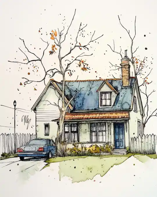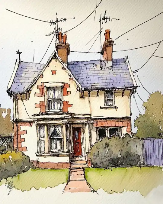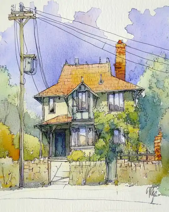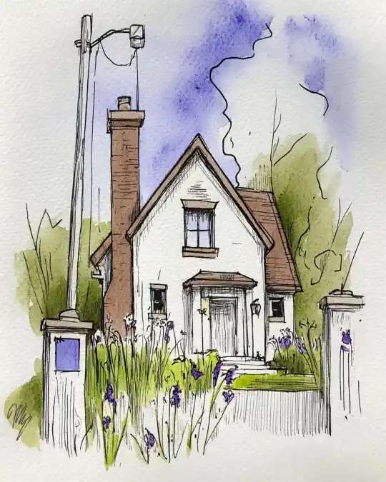 I love how the ink gives the home a clear structure. The soft watercolor blends allow the background to breathe.