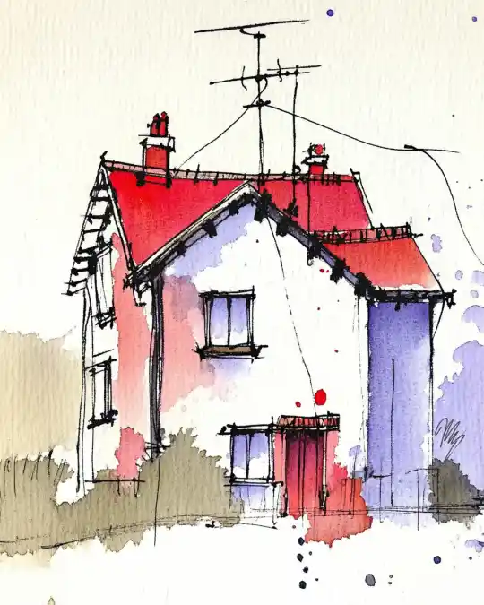 If you're just starting, you can try to use a light blue sky wash first. Then, outline the house in bold black ink