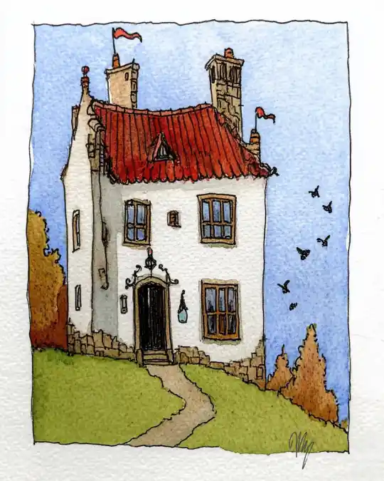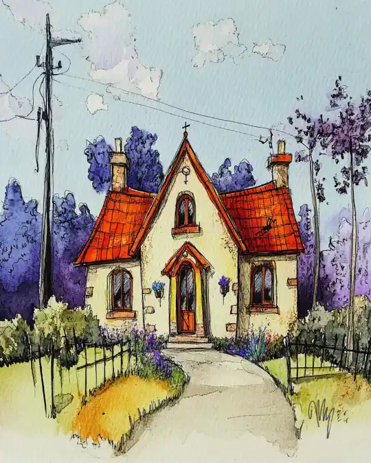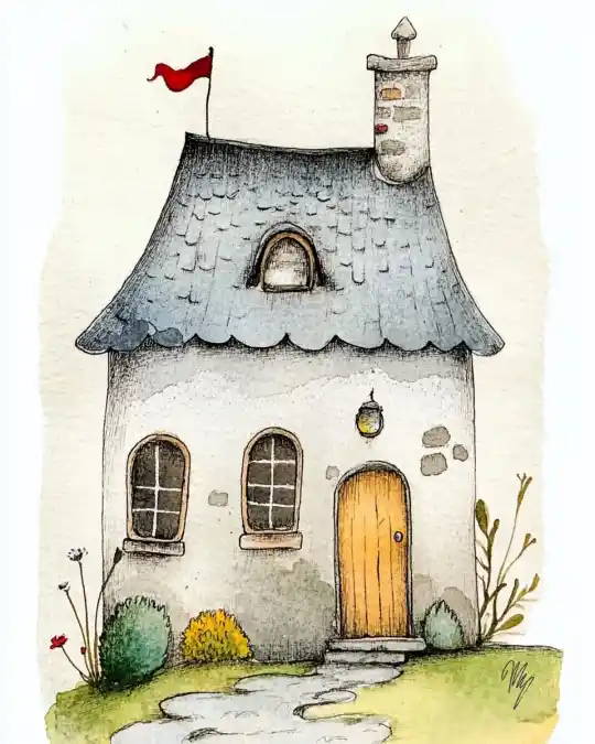 With its welcoming flag by the door and gray stone roof, this little cottage exudes charm. The ink outlines provide focus and clarity. The gentle watercolor background creates a dreamlike effect for the whole setting.
