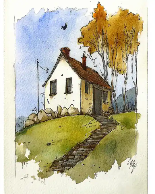 For this beautiful effect, I let the colors flow gently for the sky and hills (using wet-on-wet watercolor). I outline the house and the small path leading up to it with ink once it dries.