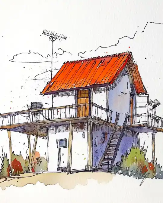 This tall house, built on wooden posts, is something I always enjoy drawing. Sketching the stairs that lead to the large balcony is enjoyable. The striking feature here is the bright, cheery orange roof.