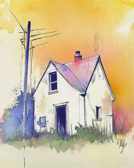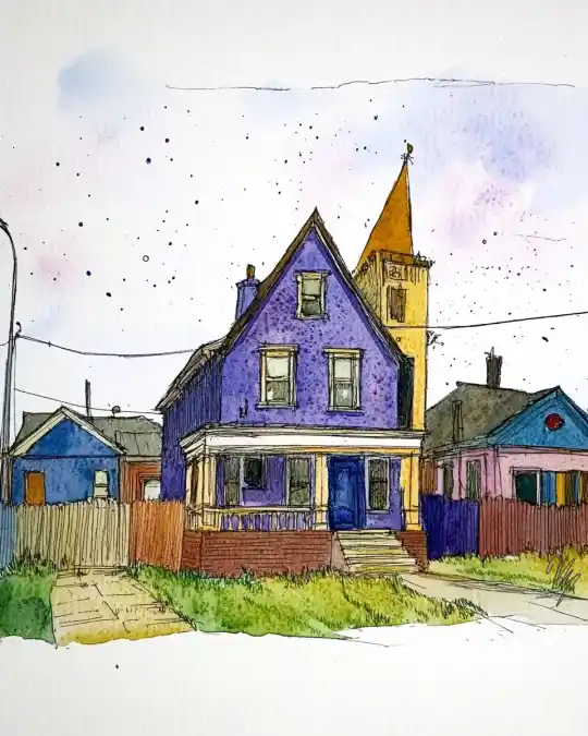 This city scene glows with warm golden tones set against a cool blue sky. Strong ink outlines that draw attention to the house make it stand out.