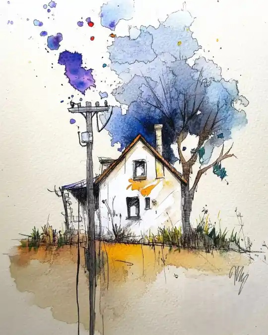 I prefer to outline the house with strong, steady ink strokes after combining gentle hues in the sky and trees.