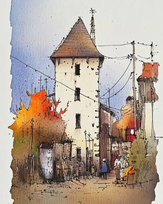 The tower appears solid and proud, as though it had stood the test of time. I use wet-on-wet watercolor to mix the sky, allowing the blue to blend gently. I also add tiny dots and ink lines to create more textures.
