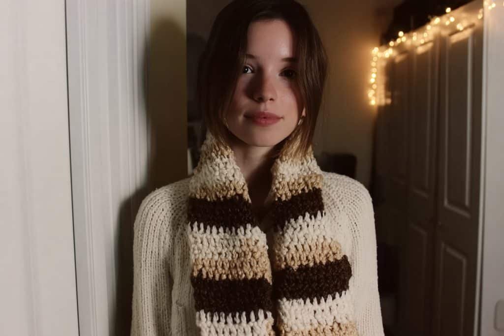 Beginners can try this pattern to explore different row sizes and color changes. A crochet hook with a 5.5 mm size will work best for this project. This simple crochet scarf lets crocheters experiment with stitch counts without stress!