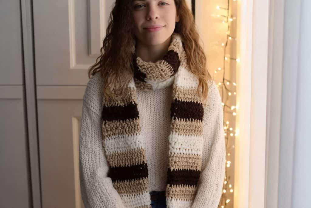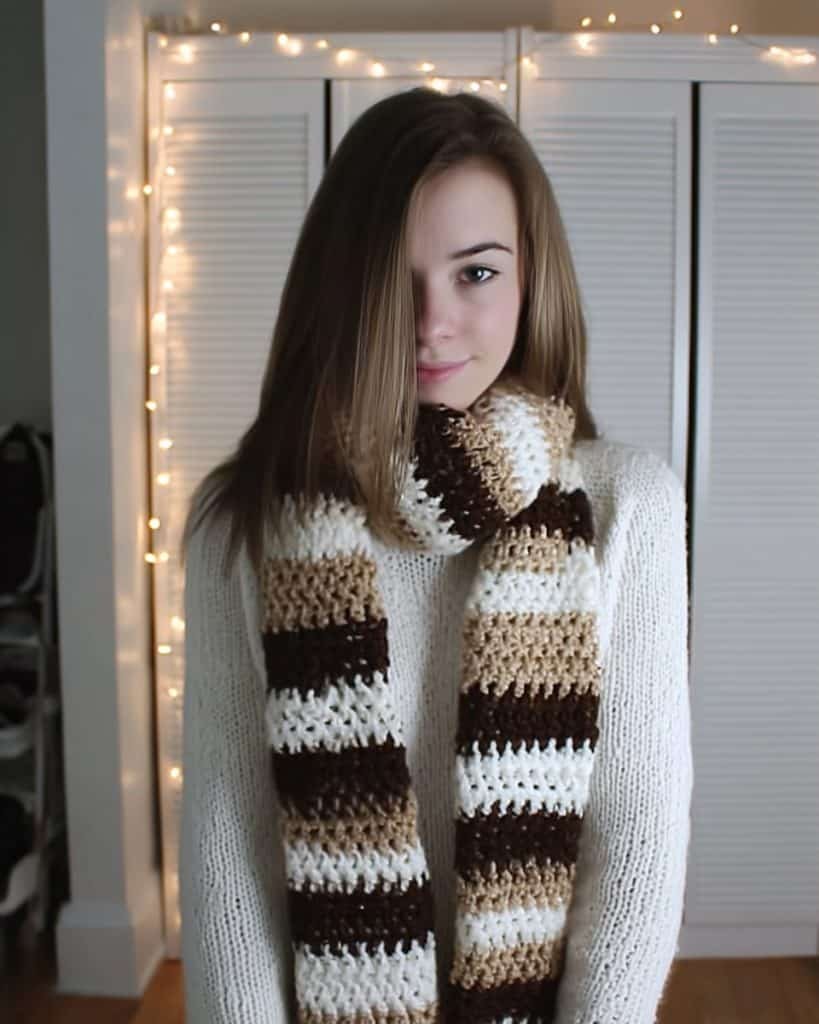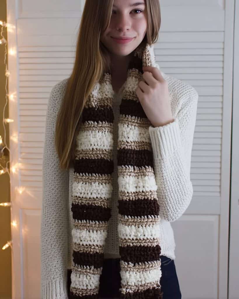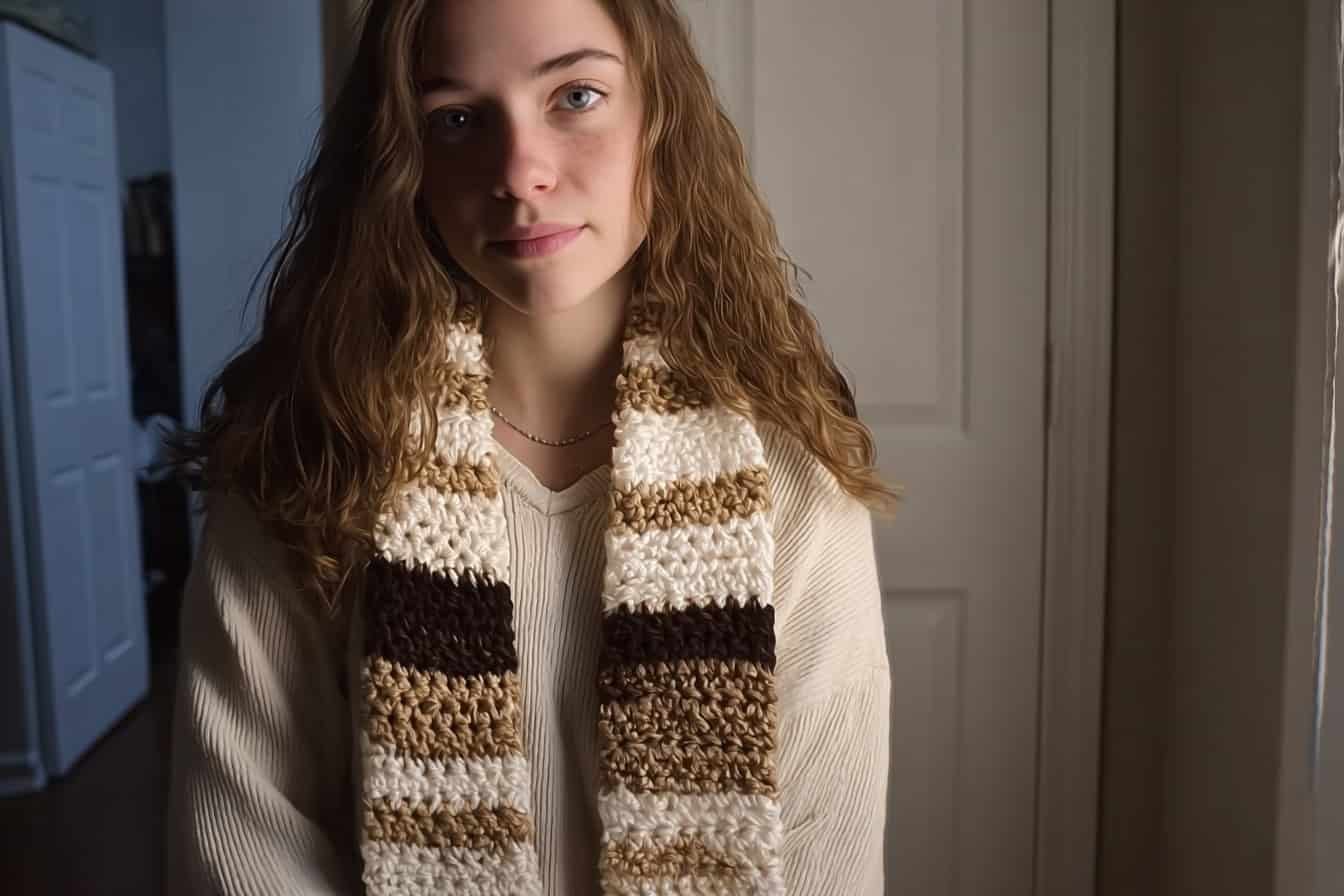This scarf uses 100% acrylic yarn in brown, tan, and cream shades. The mix of colors adds warmth and texture to the design. Its rows are not uniform in size, giving it a fun, playful look.