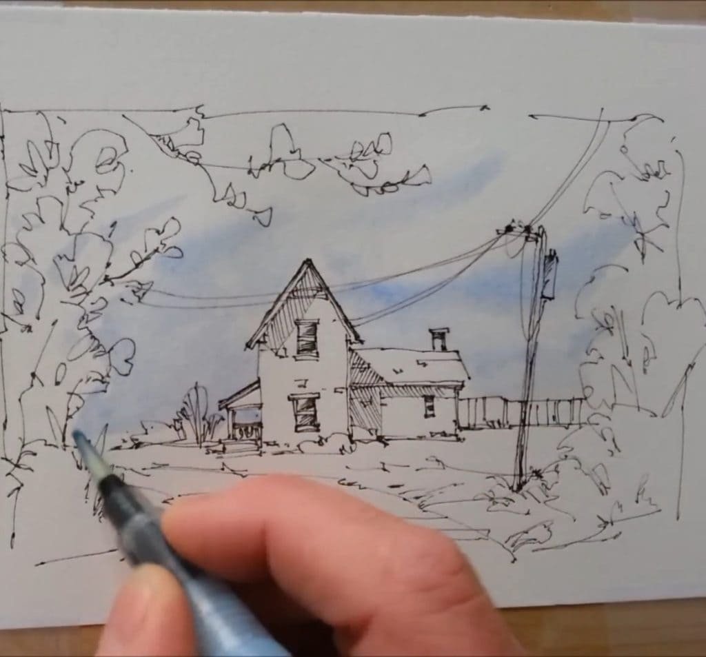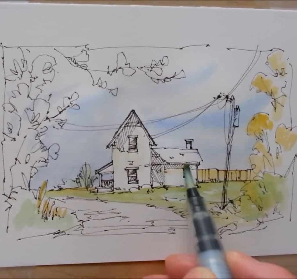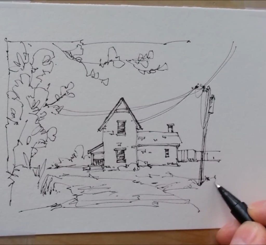 He starts with simple lines to capture the farmhouse walls and roof. The strokes are confident but not rigid. By keeping the drawing loose, the later watercolor washes can bring life and softness to the scene.