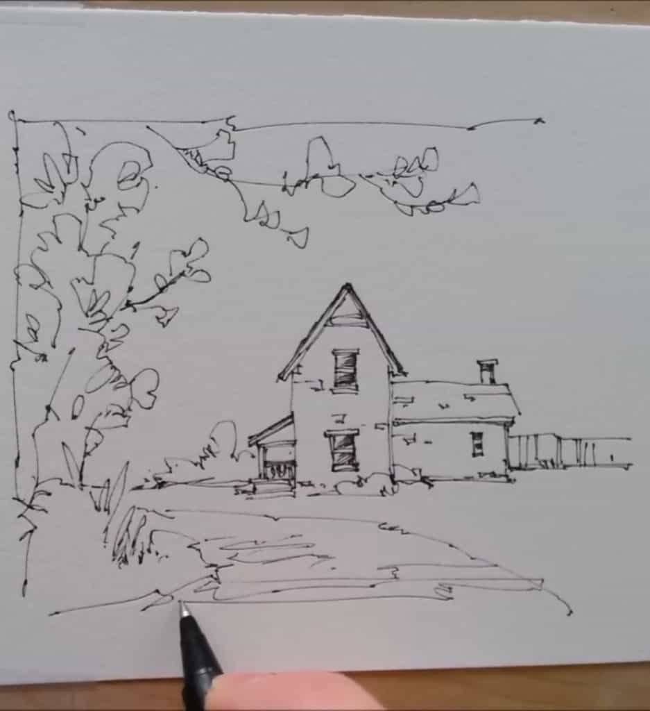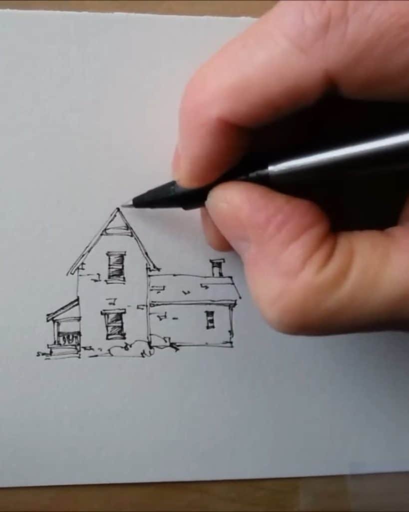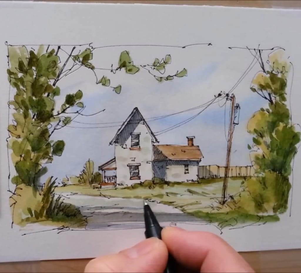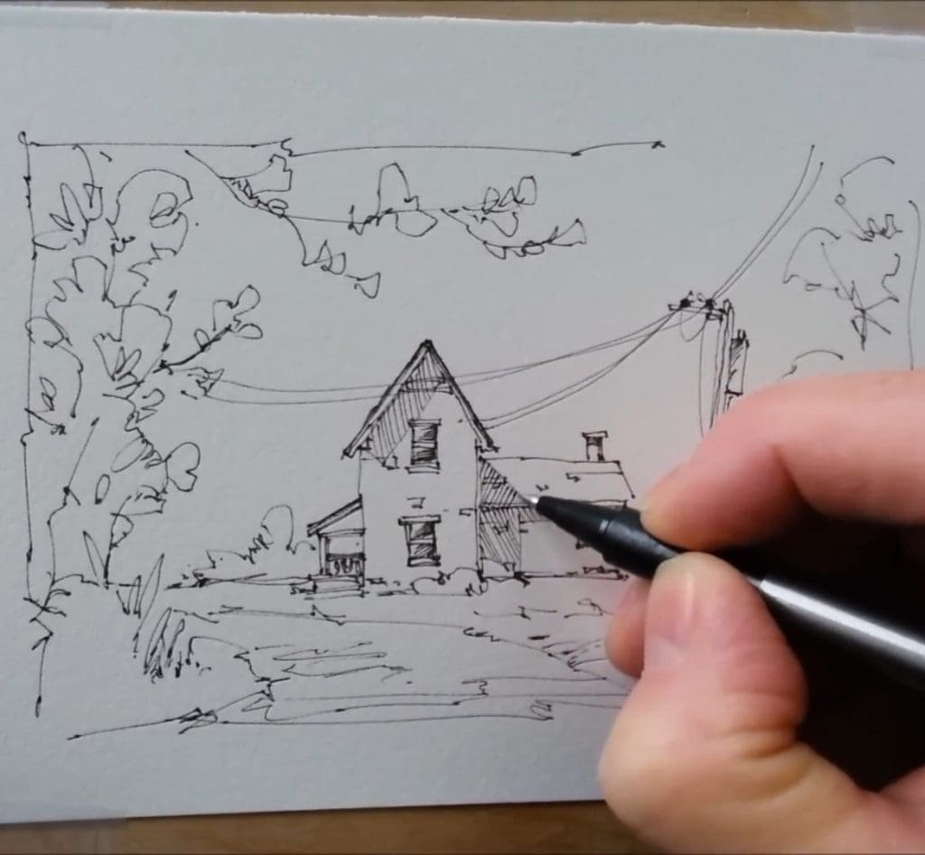 He starts with simple lines to capture the farmhouse walls and roof. The strokes are confident but not rigid. By keeping the drawing loose, the later watercolor washes can bring life and softness to the scene.