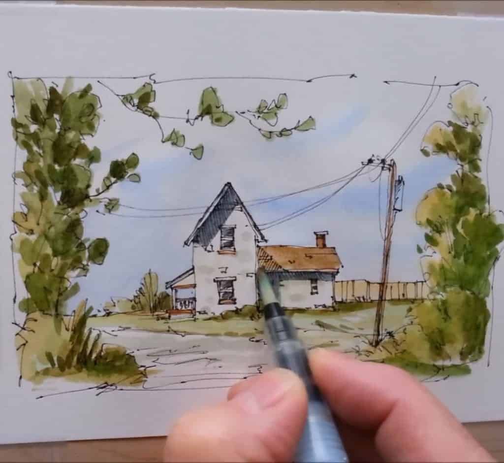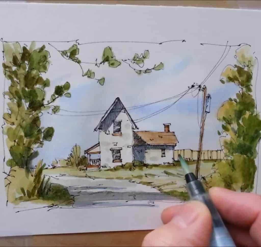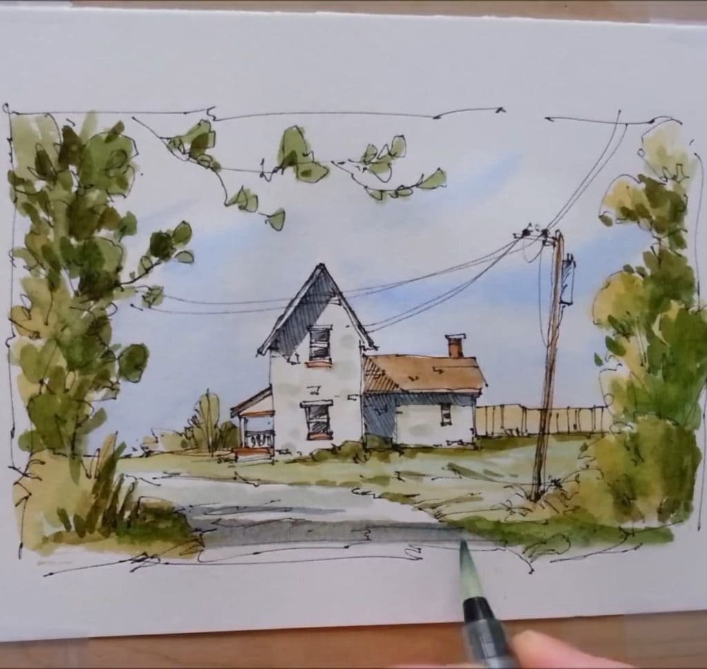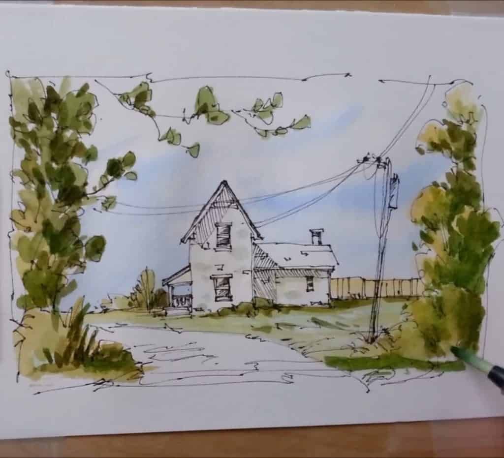 How to Paint a Fall Farmhouse in Pen and Wash Watercolor Technique