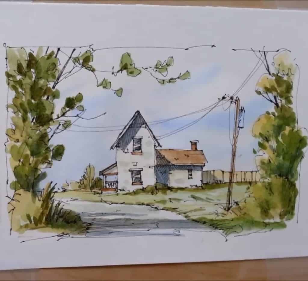 The first step is sketching. Peter begins with pen work to build a strong framework. This stage gives the farmhouse its structure before any color is added.