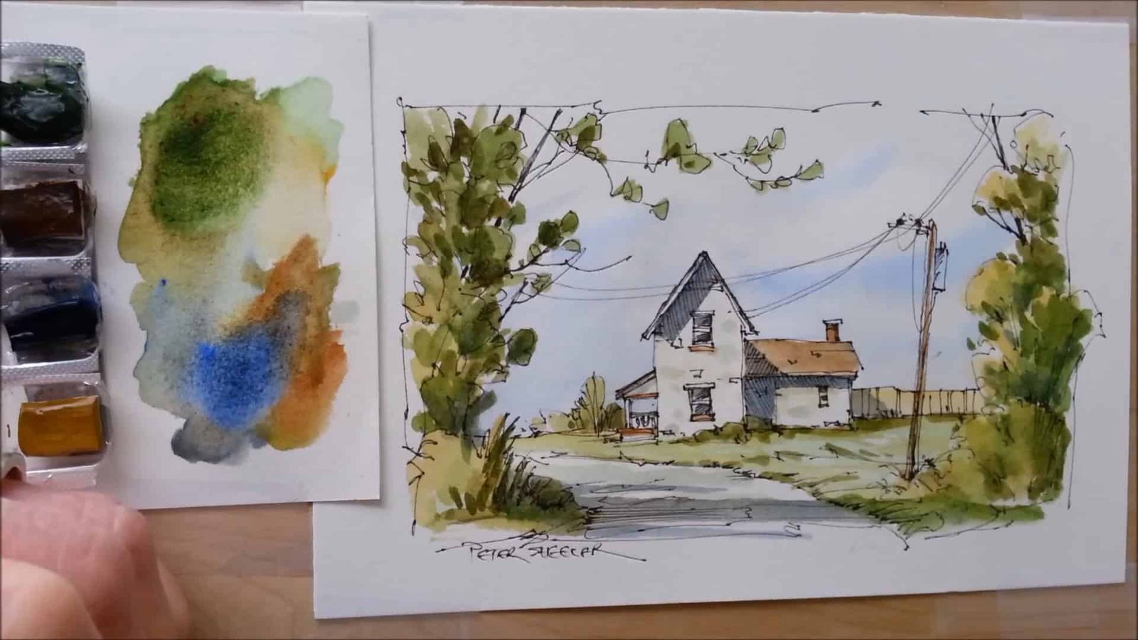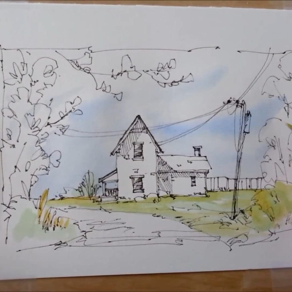 In his channel, Peter Sheeler Art, Peter Sheeler demonstrates how pen and wash can capture structure and atmosphere at the same time. His Fall Farmhouse tutorial blends confident ink lines with soft, loose watercolor layers.
