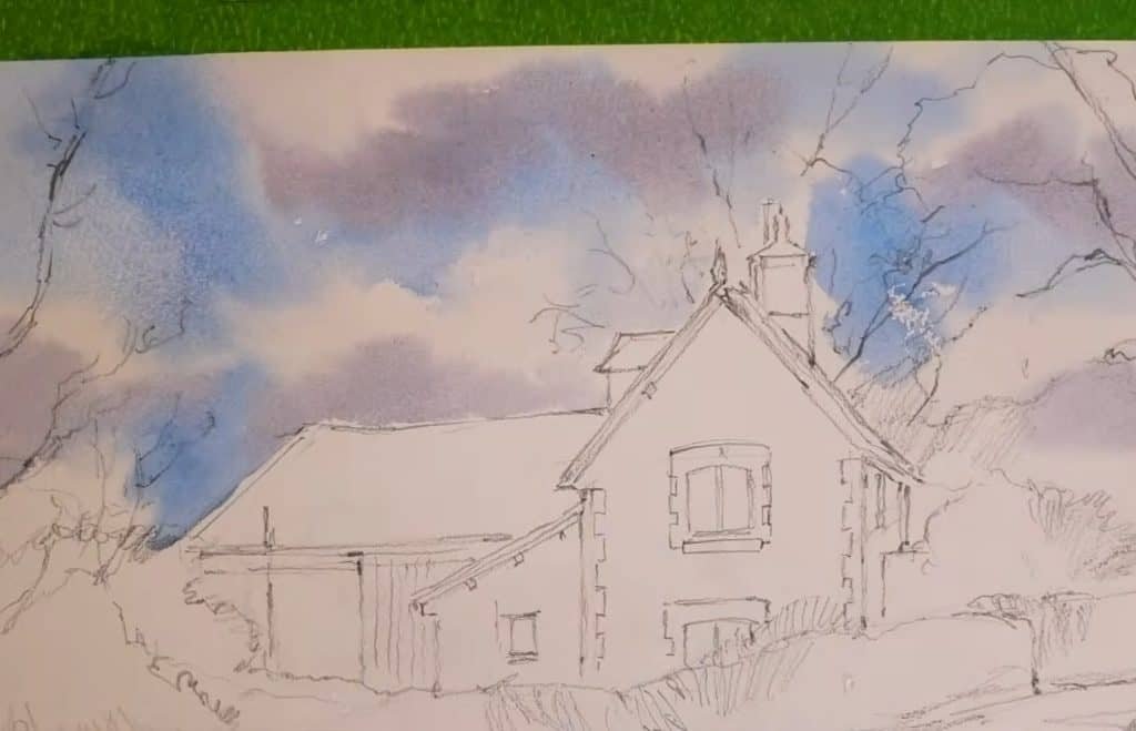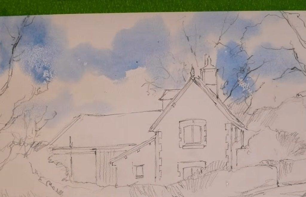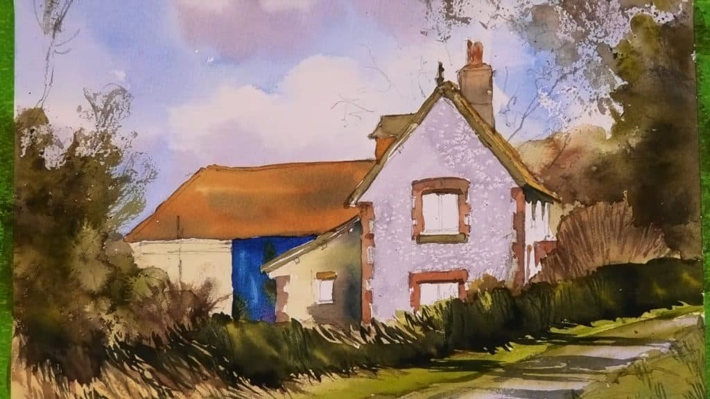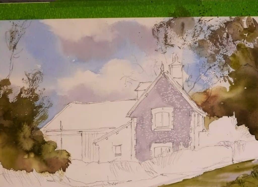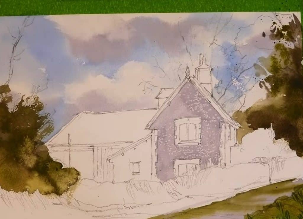 The sky sets the mood for the farmhouse scene. Paul Clark starts with a wet wash.