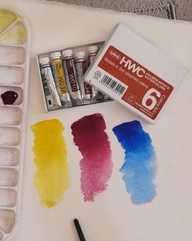 For this tutorial, Paul Clark tries Holbein paints, a Japanese brand. The six-tube set includes Permanent Yellow Deep, Cobalt Blue Hue, Crimson Lake, Burnt Sienna, Vermilion Hue, and Viridian Hue. He limits himself to only three: yellow, blue, and red.