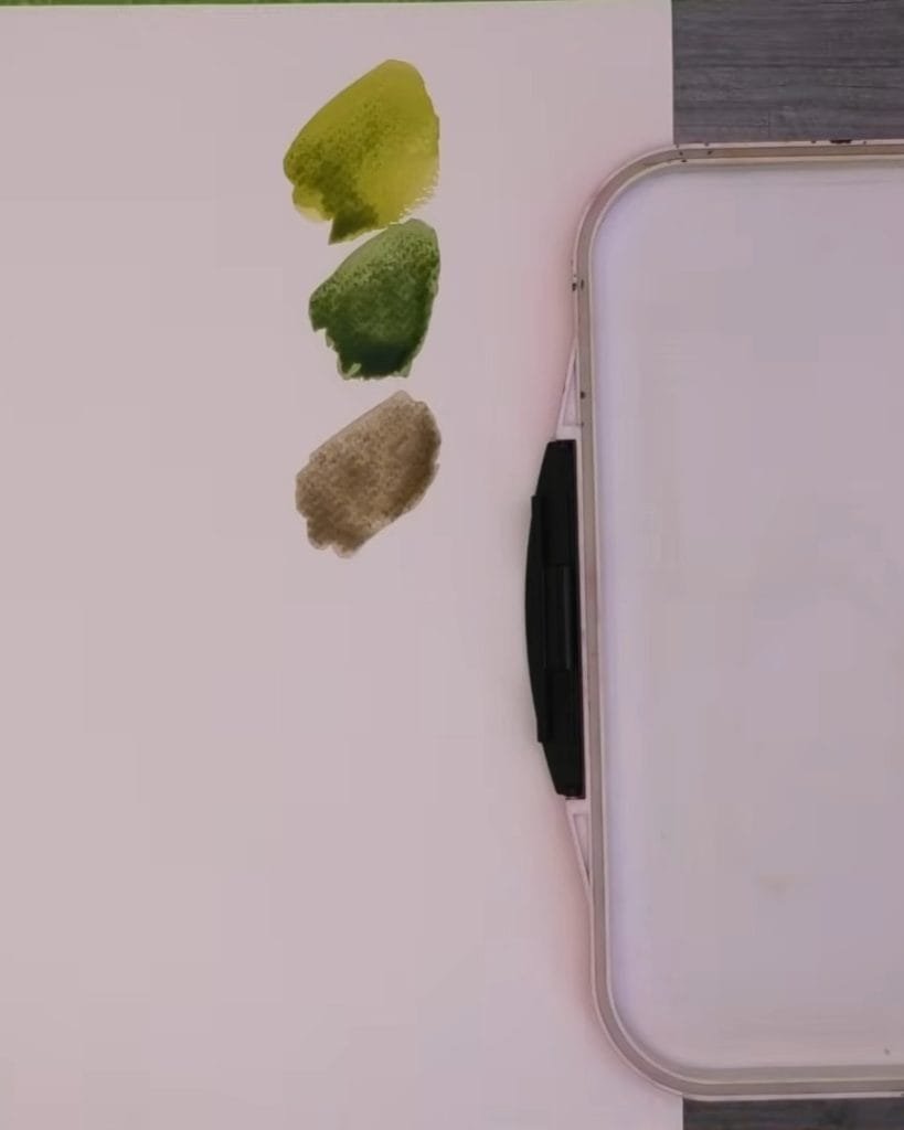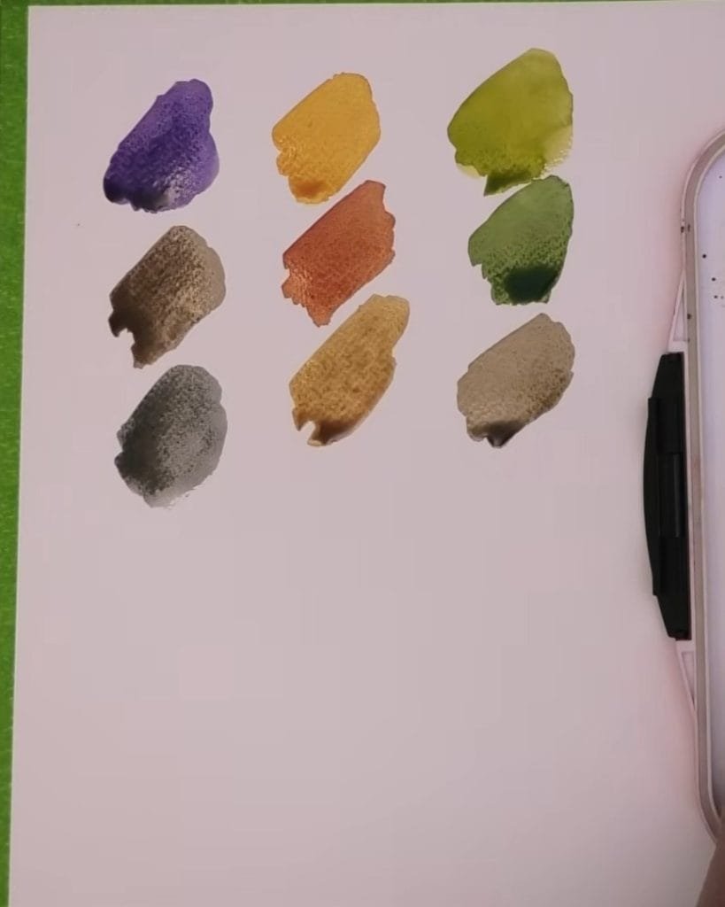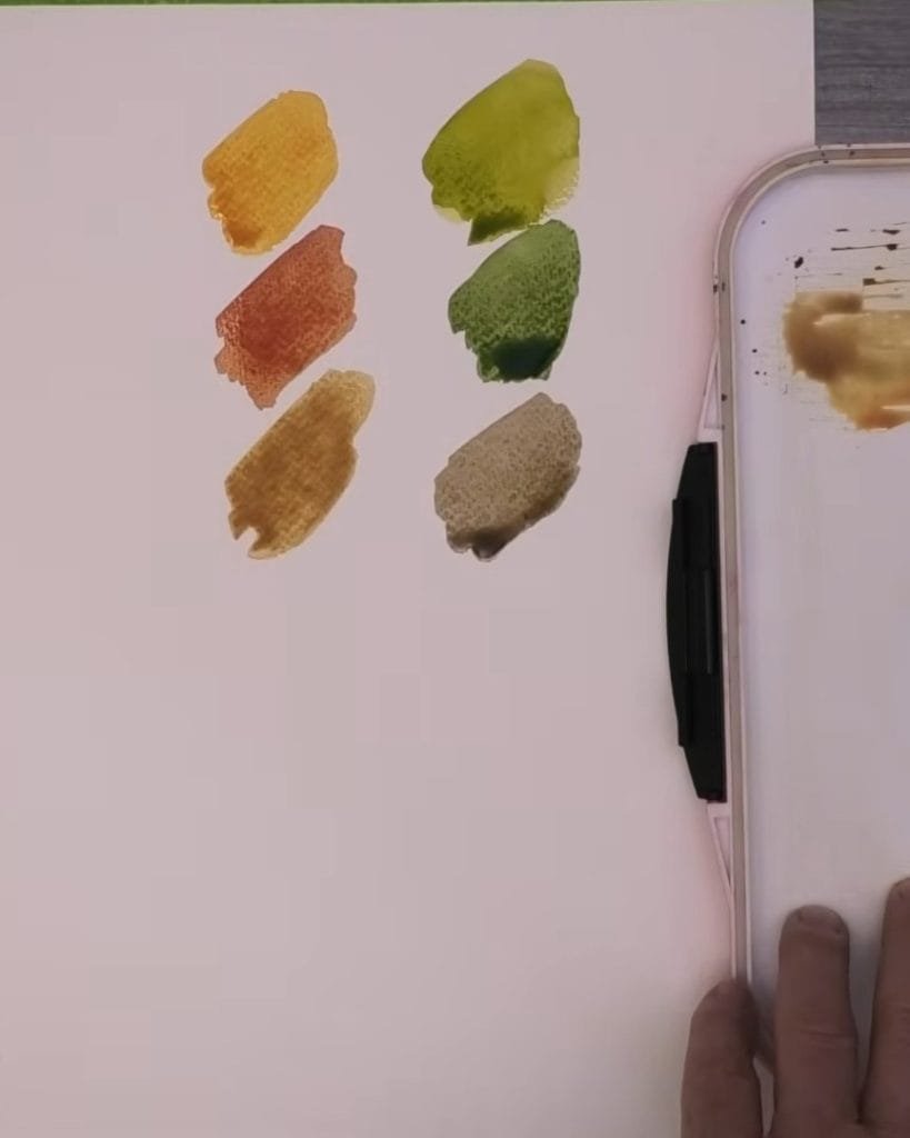 He mixes browns and greens directly from the primaries. Ratios vary, but all come from the same three colors.