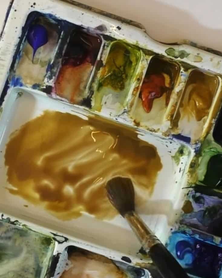 Paul mixes Yellow Ochre, Burnt Umber, and water for darker sand tones. This gives warm, natural shadows.