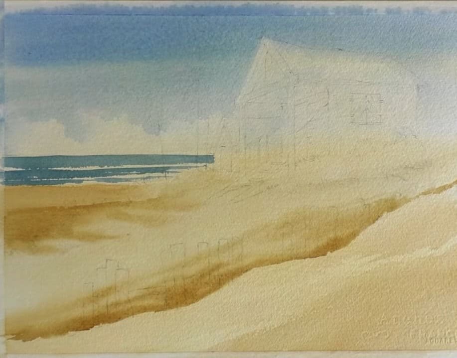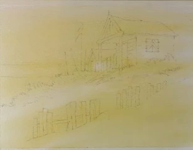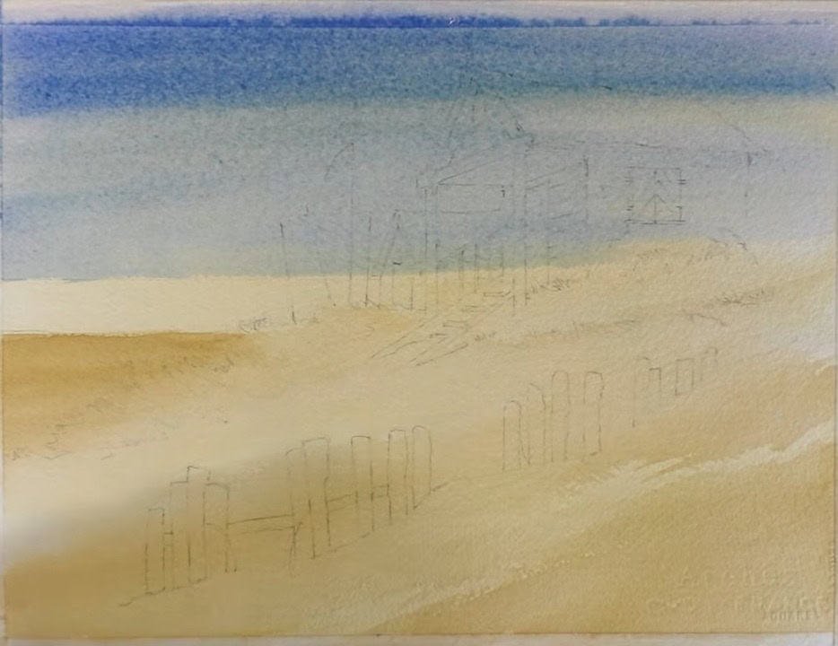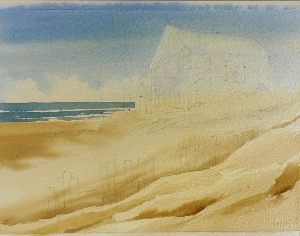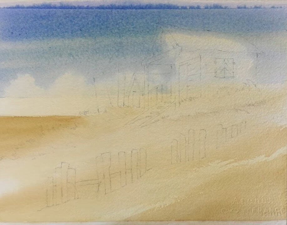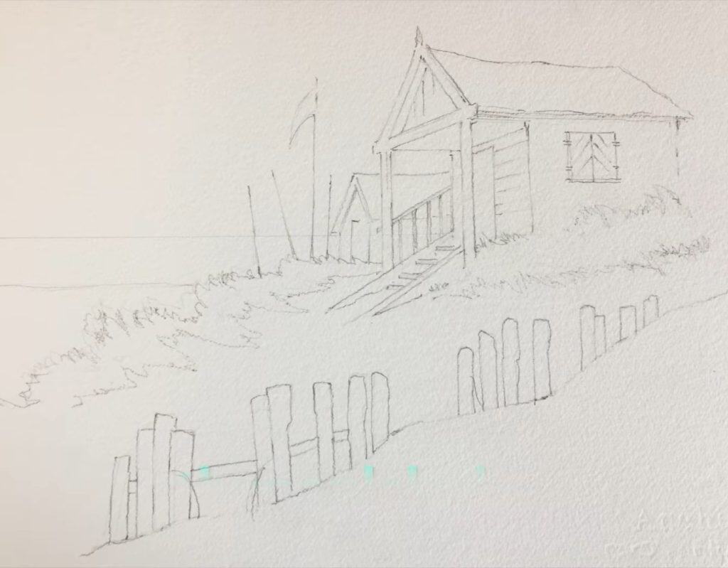 Now it’s time to sketch. Clark suggests a basic line drawing of the huts and dunes.