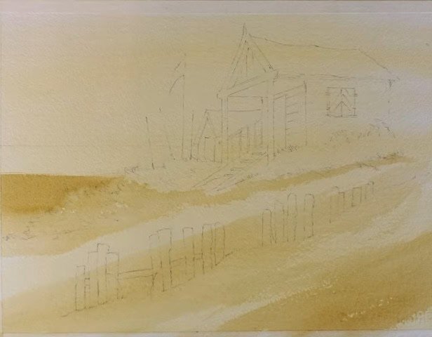 The first wash sets the overall tone. Paul wants the whole painting to feel warm.