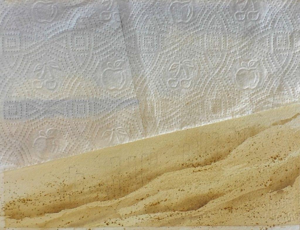 He uses this for darker sand shadows under grasses and along the ridge. After drying, he softens the edges with damp tissue.