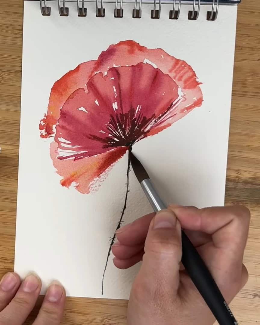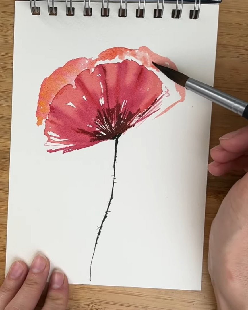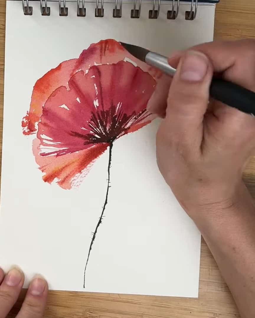 With these colors added, the poppy feels fuller and more vibrant. Next, the stem and its texture are painted.