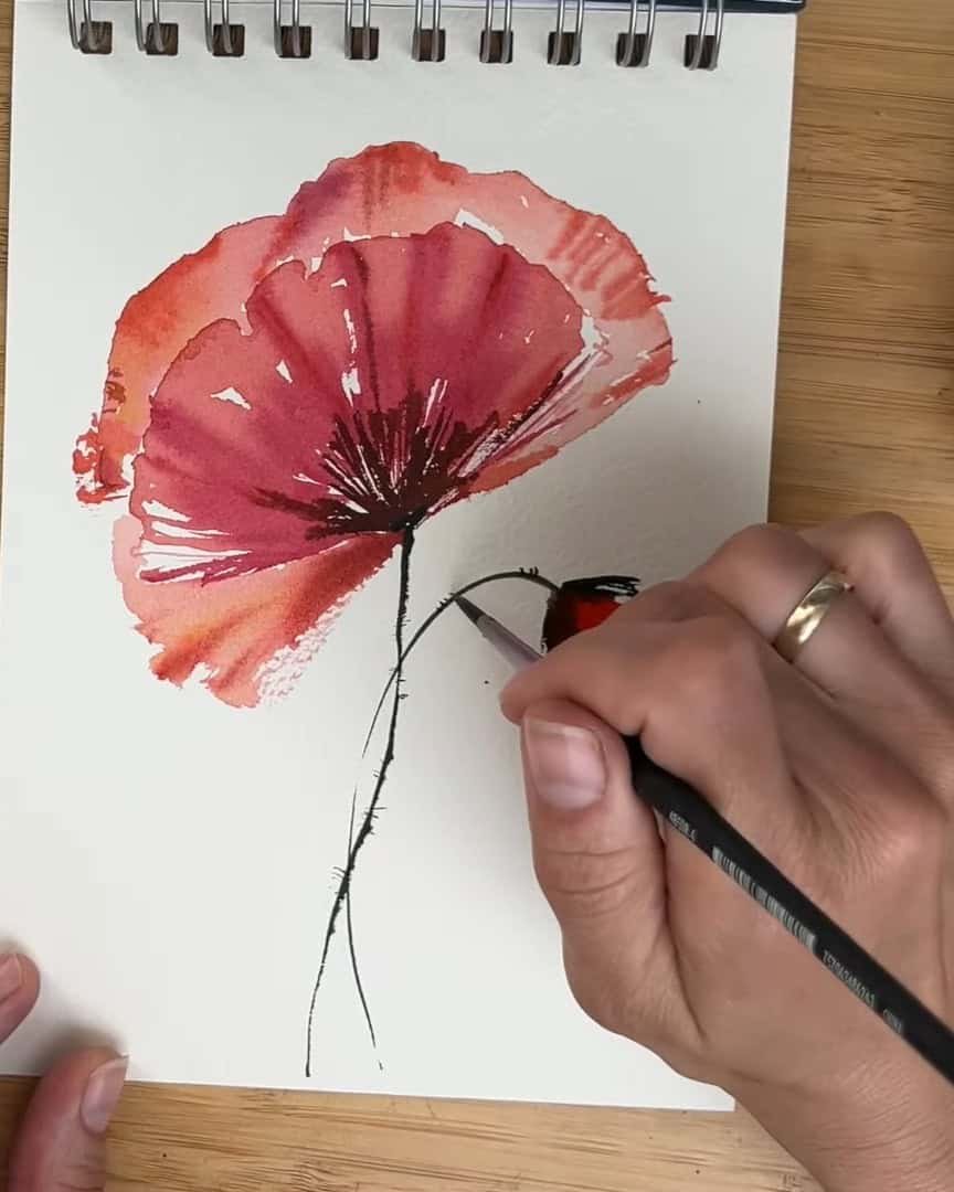 Strokes are kept vivid and freehand to capture the natural, lively feel of the poppy plant.